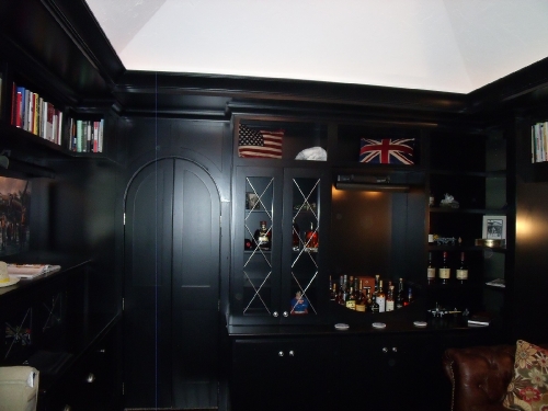 Office Painted Black with Panels and Shelves Covering Entire Room.